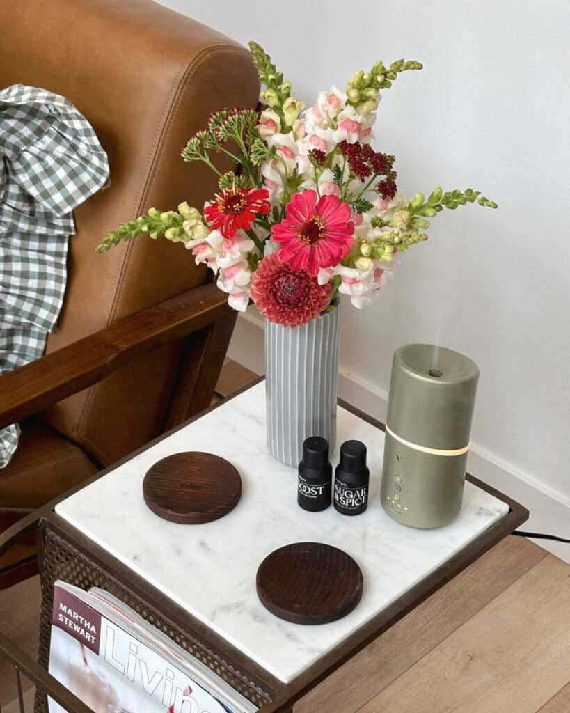 Let’s start with the easiest way to make your house smell good fast. Personally, I love coming home to my sleek, modern diffuser that silently disperses my favourite vanilla essential oil. Whether you crave the calming scent of lavender, the zesty kick of citrus, or the grounding notes of eucalyptus, a non-toxic essential oil diffuser is your best chance for a fragrant escape. I’d suggest checking out the Vitruvi Move diffuser. It’s a cordless device with a charging base, so you can easily take it anywhere with you. I have two of these – one downstairs in the kitchen and one upstairs in our bonus room (that I often bring with me into the bathroom when I’m having a bath, for a little spa moment).